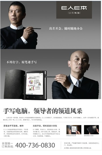 经过半年的前期策划,2009年8月,E人E本在天津开始试销,用平面广告,测试市场反应、寻找最有效的广告诉求。