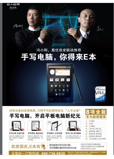 冯葛两人接触E人E本后,对产品功能大为赞赏,欣然同意联袂代言E人E本。于是,冯葛代言的系列广告在央视播出。
